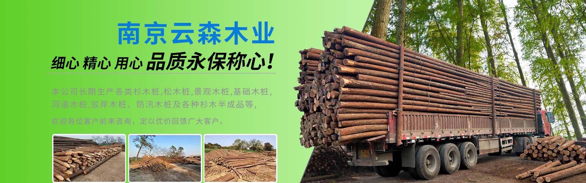 南京市云森木業有限公司位于南京市高淳區。是一家生產加工,線上銷售為一體的現代化企業。擁有完善、科學的質量管理體系及工作團隊。 公司主營松木樁,杉木樁,打樁木,河道木樁,駁岸木樁,防汛木樁,景觀木樁、園林綠化支撐桿等,也可支持方料,木板等木材定制加工產品,所選原材料均為黃山中心林區,樹齡均在三十年左右。質地緊密,樹形優美。 本公司貨源充足,供貨能力強,地處高淳,交通方便利,江浙滬皖送貨上門,當天可達。本著“誠信為本,客戶至上”的經營宗旨,真誠希望與您合作。 歡迎各位客戶前來咨詢,定以優良品質和價格回饋廣大客戶。